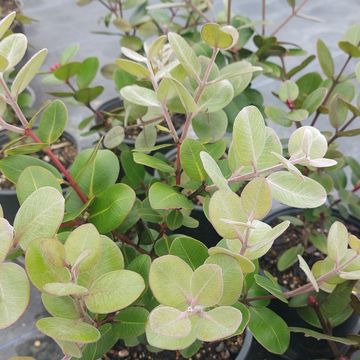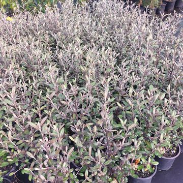Lovely shrub with oval reddish/purplish brown leaves with a puckered upper surface. Bears creamy-white flowers. Prefers full sun. Great for small hedges or contrast. Height approx. 1-2m.