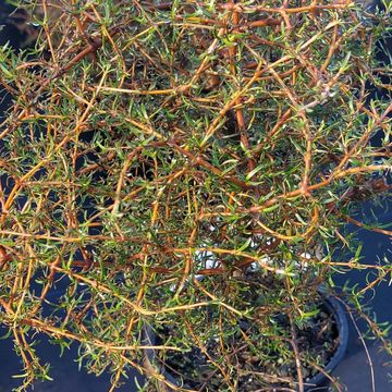 Upright shrub with thin leaves on wiry divaricating orange stems. Produces white/green tinged fruit which is attractive to birds. Fast growing and very tolerant. Approx height 3m x 2m. Prefers full sun.