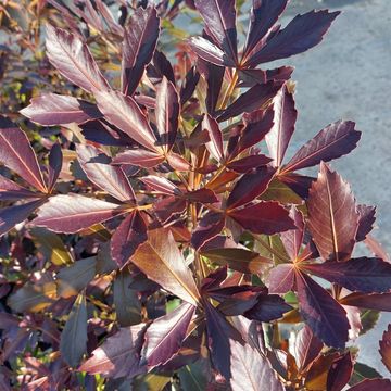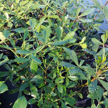Coastal five finger shrub with leathery foliage. Grows up to 6m with stout branches. Attractive lush foliage year-round with bright green new growth. Small black seeds attract birds.