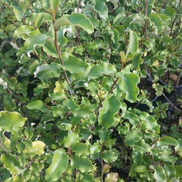 A handsome large bushy shrub/tree with distinctive red branches and wavy leaves, similar in appearance to a pittosporum. Used as a specimen, shrub border of hedge tree, height approx. 6m. Small white flowers in clusters and almost black fruit.
