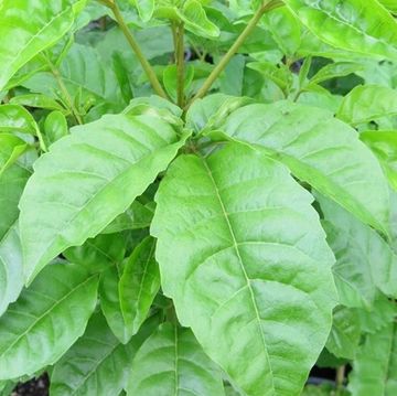 Shrub with large, dark green, glossy heart shaped leaves, has jointed dark twigs and long orange fruit, particularly useful for medical purposes.